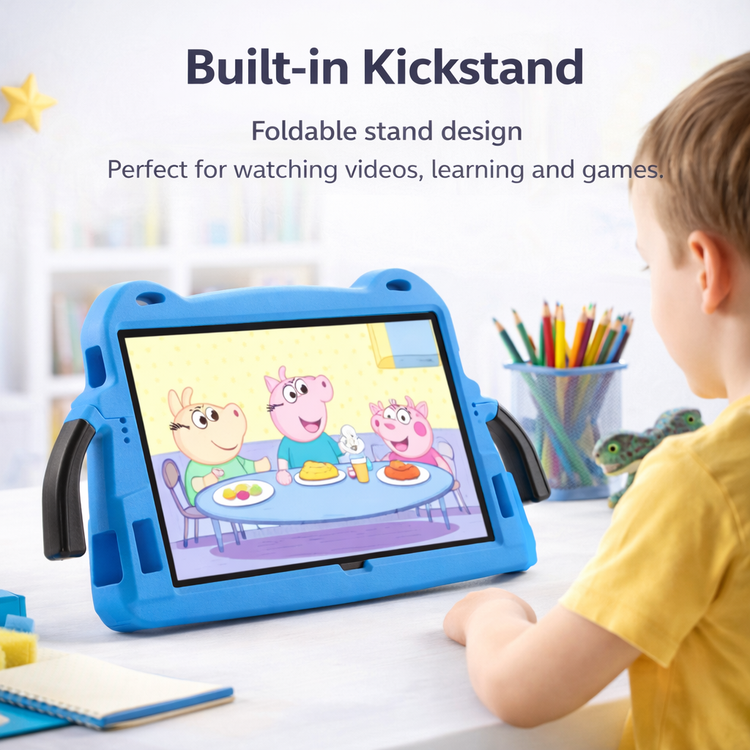 The integrated foldable kickstand allows kids to easily watch videos, attend online classes, or play games without holding the tablet.